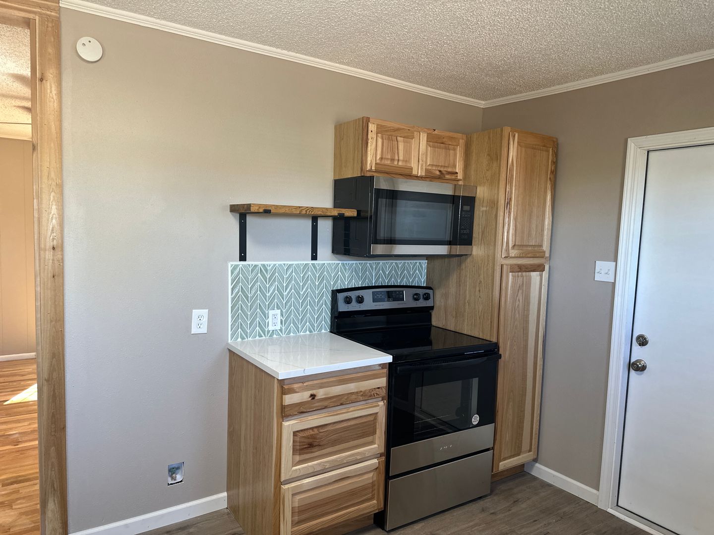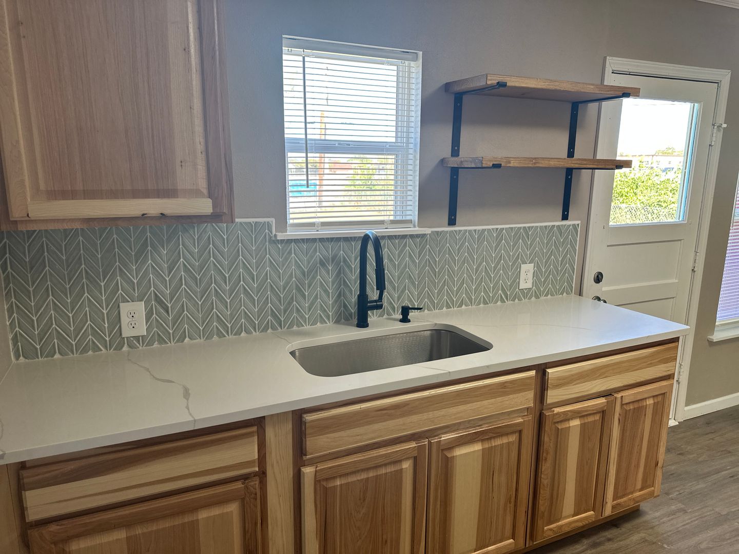 Don't miss this 2 bedroom 1 bath 1 car garage home in the heart of Abilene! You can see the water park from the backyard of this firecracker RED home. NO CARPET! All solid surface flooring throughout. Brand new granite in the kitchen with new sink, new electric range, new built in microwave, too. UPdated bathroom, Central HVAC, new garage door, new ceiling fans in every room! Tenant to provide their own fridge. Washer and dryer hookups are in the garage!